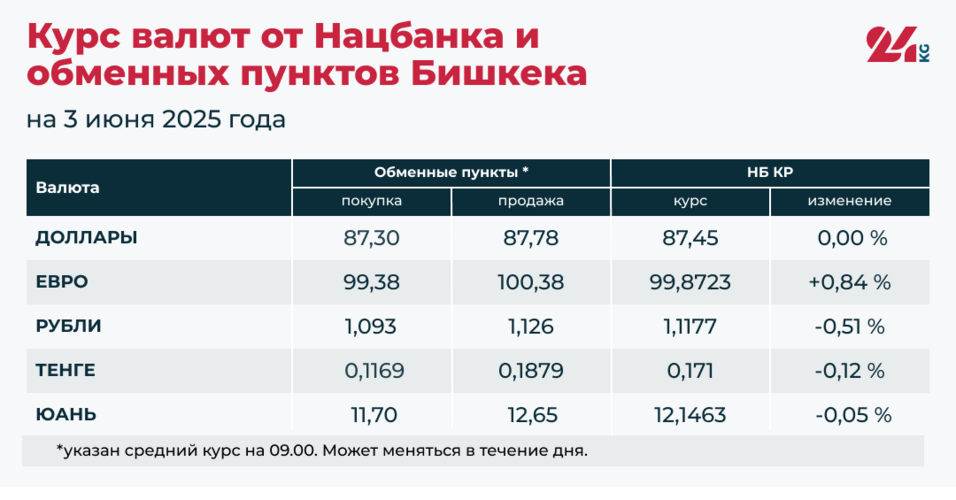- Официальный курс НБ КР: 87,45 сома (без изменений).