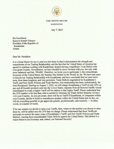 Например, президенту США направлено такое письмо. «Начиная с 1 августа 2025 года мы будем взимать с Казахстана пошлину в размере всего 25 процентов на любые и все казахстанские товары, направляемые в Соединенные Штаты, отдельно от всех секторальных пошлин», — говорится в документе за подписью Дональда Трампа, опубликованном на его странице в социальной сети.