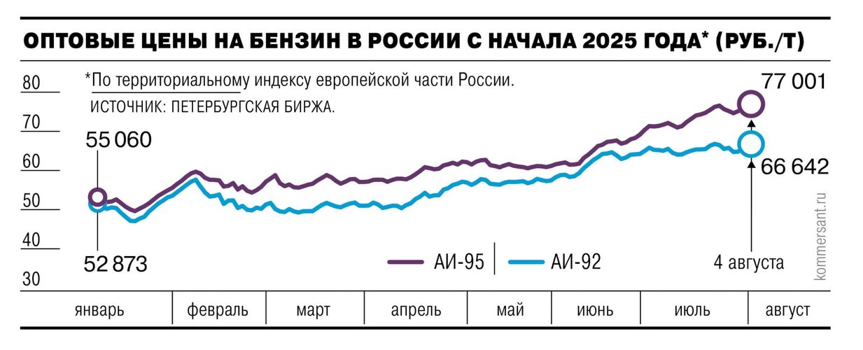 Предыдущий ценовой рекорд Аи-95 — около 76,9 тысячи рублей — был установлен в сентябре 2023 года. Затем стоимость опустилась, в начале 2025 года она составляла около 55 тысяч рублей за тонну.