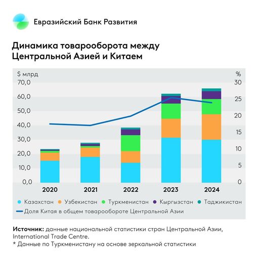 «Значимость КНР как торгового партнера Центральной Азии стремительно растет. Ее доля в общем товарообороте стран региона выросла с 17,7 до 24,1 процента за 2020-2024 годы (+6,4 процентных пункта).