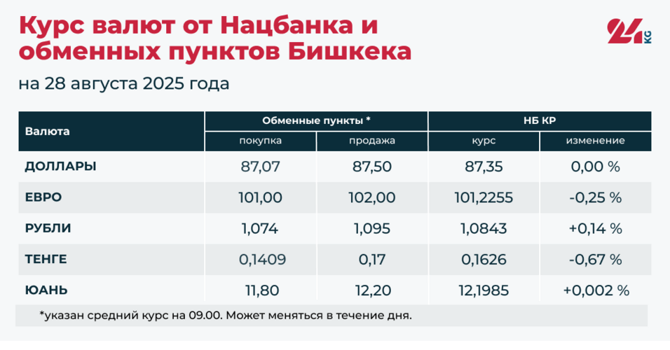 - Официальный курс НБ КР: 87,35 сома (без изменений).