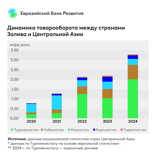Самые высокие темпы роста торговли со странами Залива продемонстрировали Туркменистан (9,9 раза), Кыргызстан (9,5 раза) и Узбекистан (8,1 раза).