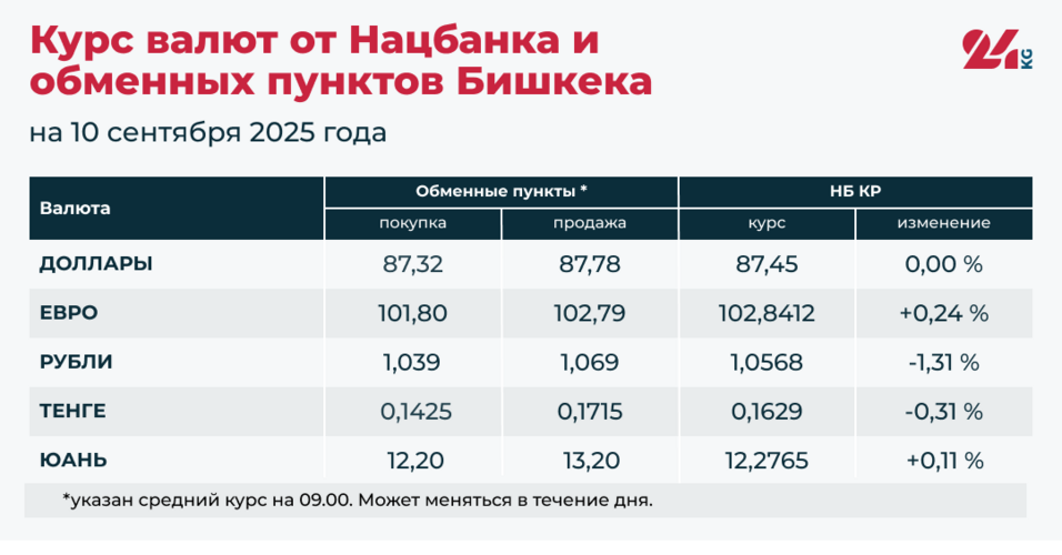 - Официальный курс НБ КР: 12,2765 сома (рост на 0,11 процента). Плавное укрепление. Тренд: +0,6 процента за сентябрь.