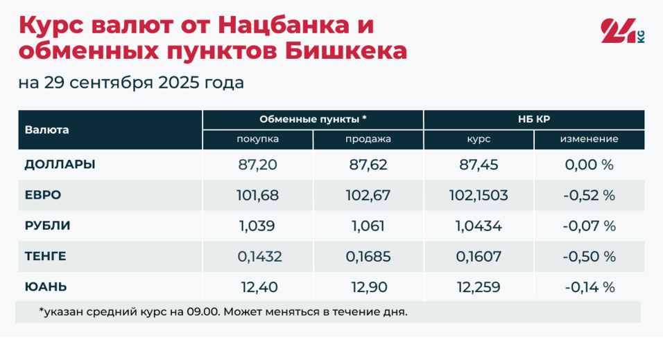 - Официальный курс НБ КР: 87,45 сома (без изменений).