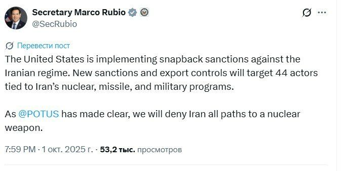 Госсекретарь Марко Рубио сообщил, что США снова вводят санкции против Ирана. Об этом он написал в своем аккаунте в сети Х.