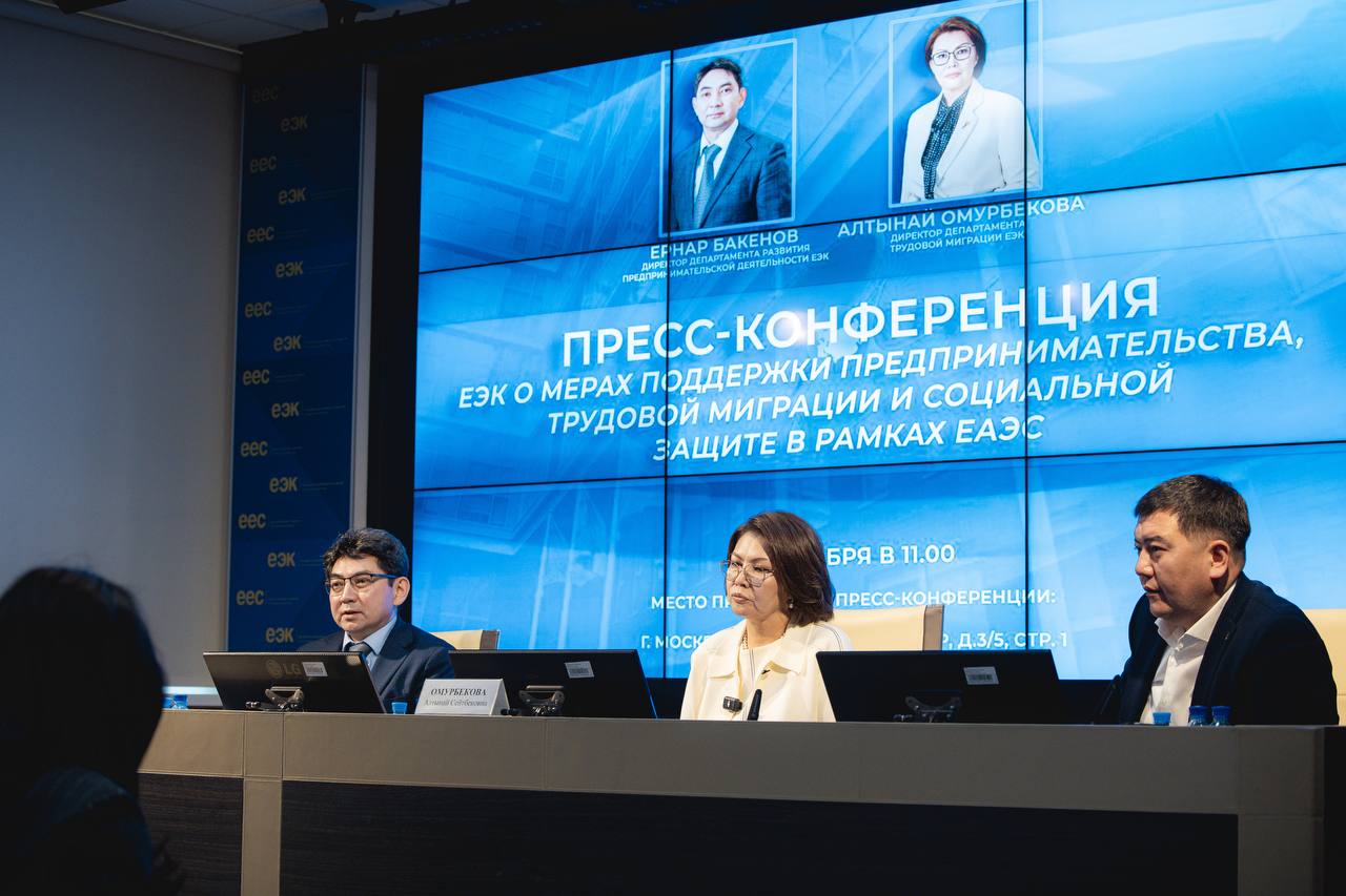 В Евразийской экономической комиссии прошла пресс-конференция директора департамента развития предпринимательской деятельности ЕЭК Ернара Бакенова и директора департамента трудовой миграции и социальной защиты ЕЭК Алтынай Омурбековой.