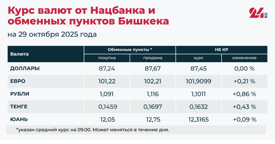- Средний курс в обменных пунктах: покупка — 87,24 сома, продажа — 87,67 сома.