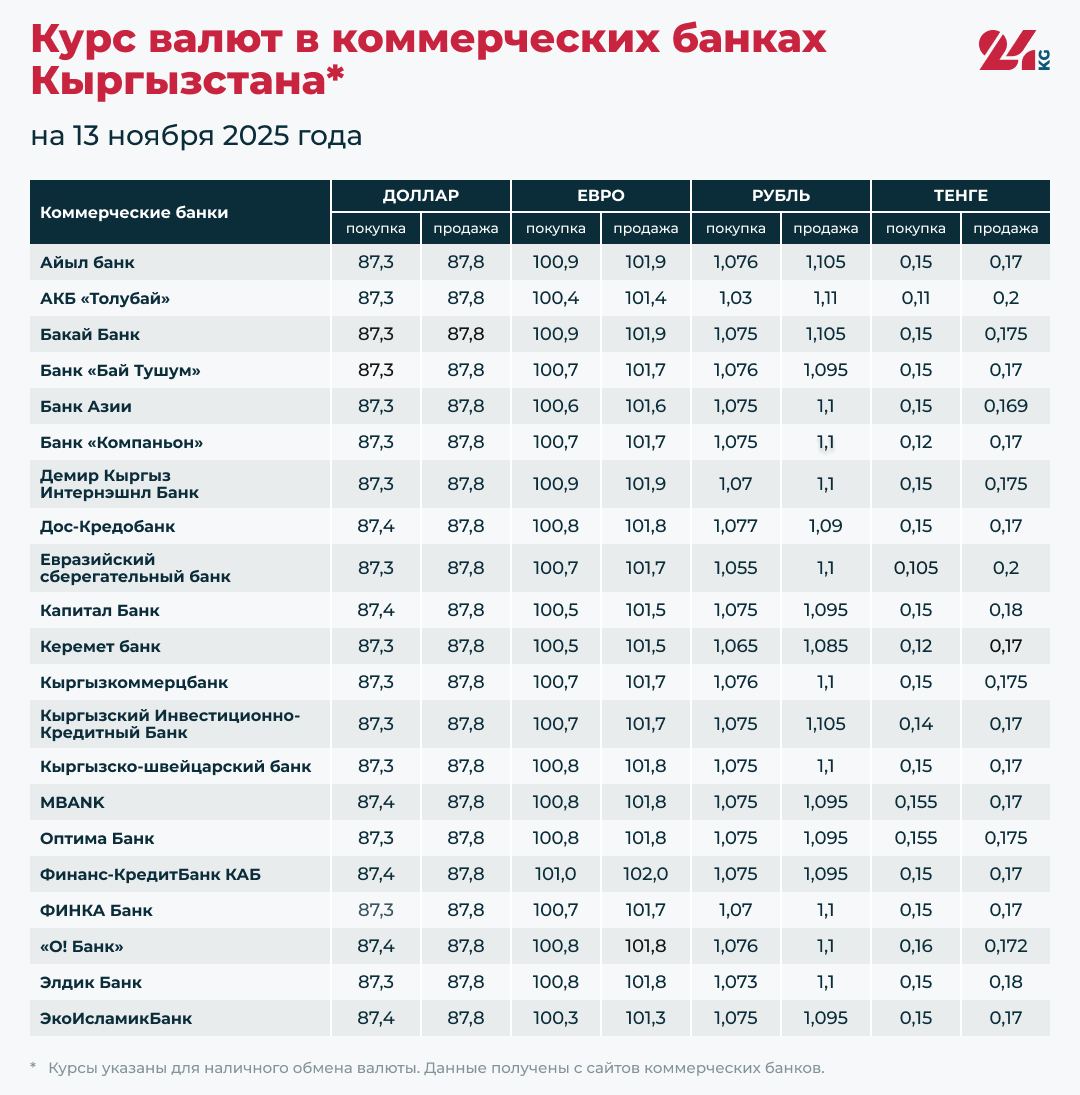 Курс валют в коммерческих банках Кыргызстана на 13 ноября
