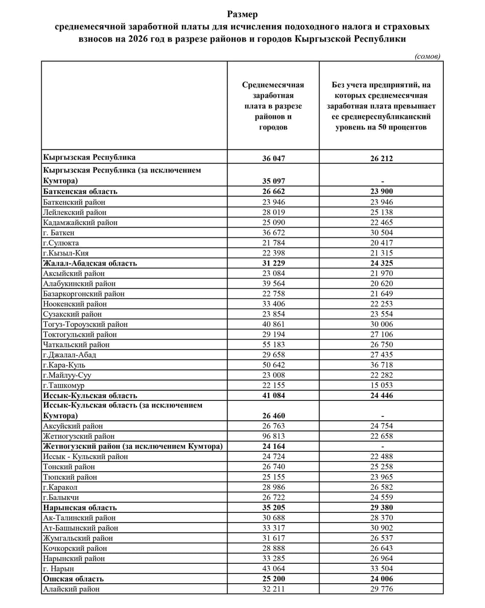 В Кыргызстане утвердили показатели средней зарплаты для расчета налогов. По данным Налоговой службы, на 2026 год установлены новые значения среднемесячной заработной платы по областям, районам и городам, которые будут использовать для расчета подоходного налога и страховых взносов.