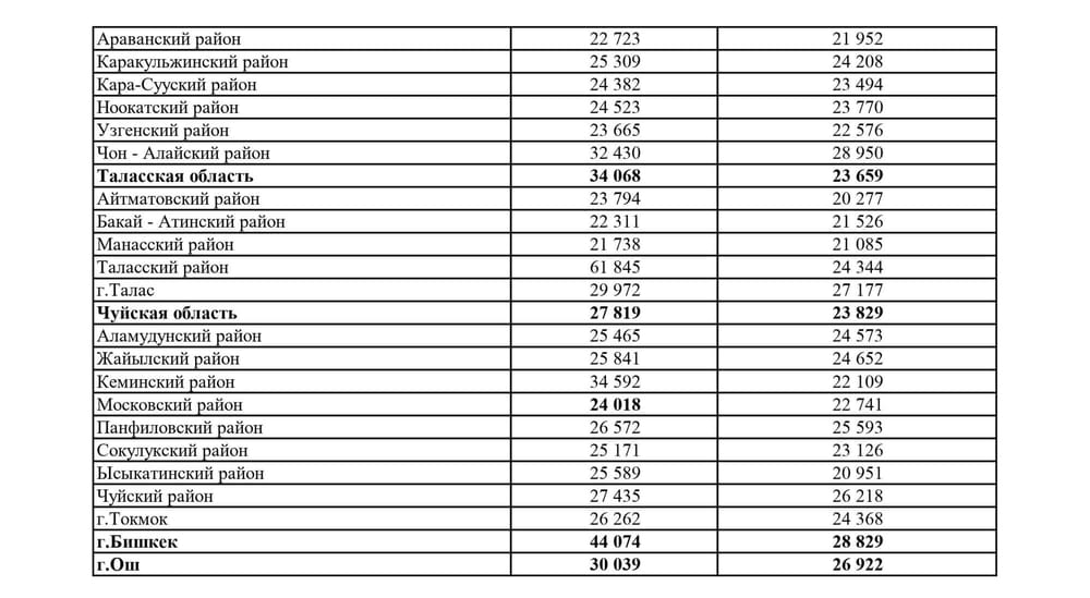 Самые высокие значения отмечены в столице — 44 тысячи 74 сома, Нарыне — 43 тысячи 64, Таласском районе — 61 тысяча 845, Кара-Куле — 50 тысяч 642, Чаткальском районе — 55 тысяч 183.