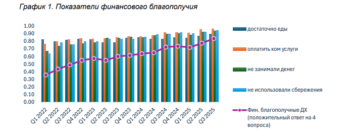 Эти макроэкономические сдвиги сформировали базу для улучшения финансовой устойчивости домохозяйств: к третьему кварталу прошлого года около 90 процентов семей могли позволить себе продукты и оплату коммунальных услуг, а общий индекс финансовой устойчивости вырос с 35 процентов в начале 2022-го до 80 процентов в 2025-м.