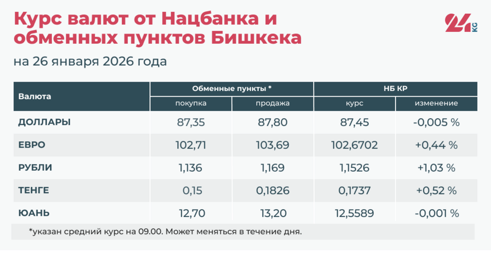 - Официальный курс НБ КР: 87,4496 сома (снижение на 0,005 процента).