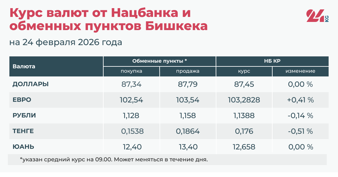 - Официальный курс НБ КР: 87,45 сома (без изменений).