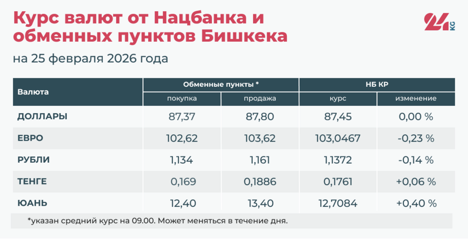 - Официальный курс НБ КР: 87,45 сома (без изменений).