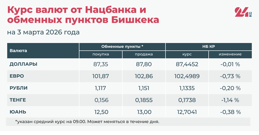 - Официальный курс НБ КР: 12,7041 сома (снижение на 0,38 процента).