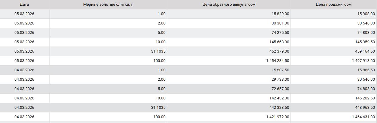 4 марта цена обратного выкупа составляла 442 тысячи 328.50 сома, за сутки унция золота подорожала на 10 тысяч 50 сомов.