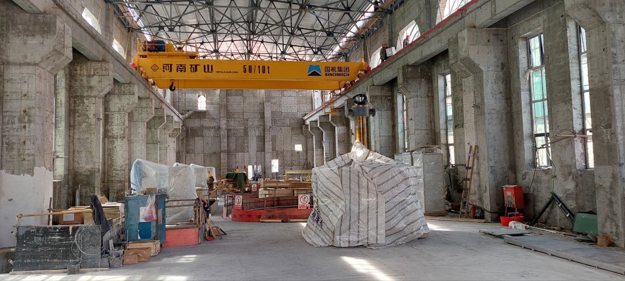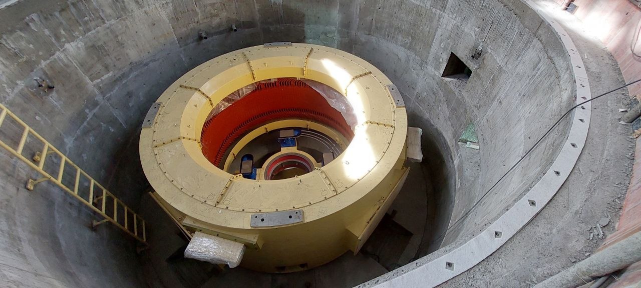 В «сердце» ГЭС — машинном зале — строители подготовили основу для генератора и сейчас собирают первую турбину.