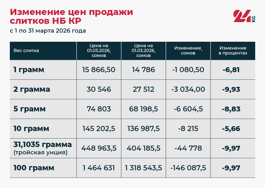 Редакция 24.kg изучила данные НБ КР, чтобы понять, как изменилась стоимость золота за первый месяц весны и какую реальную прибыль получили владельцы слитков с начала года.