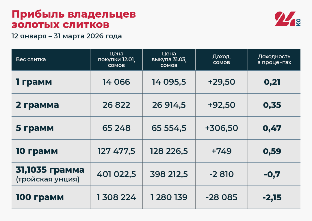 Мы ведем отсчет с 12 января 2026 года — первого рабочего дня после новогодних каникул. Несмотря на мартовский спад, золото с начала года все еще показывает положительную динамику в сомовом эквиваленте для тех, кто купил его в январе.