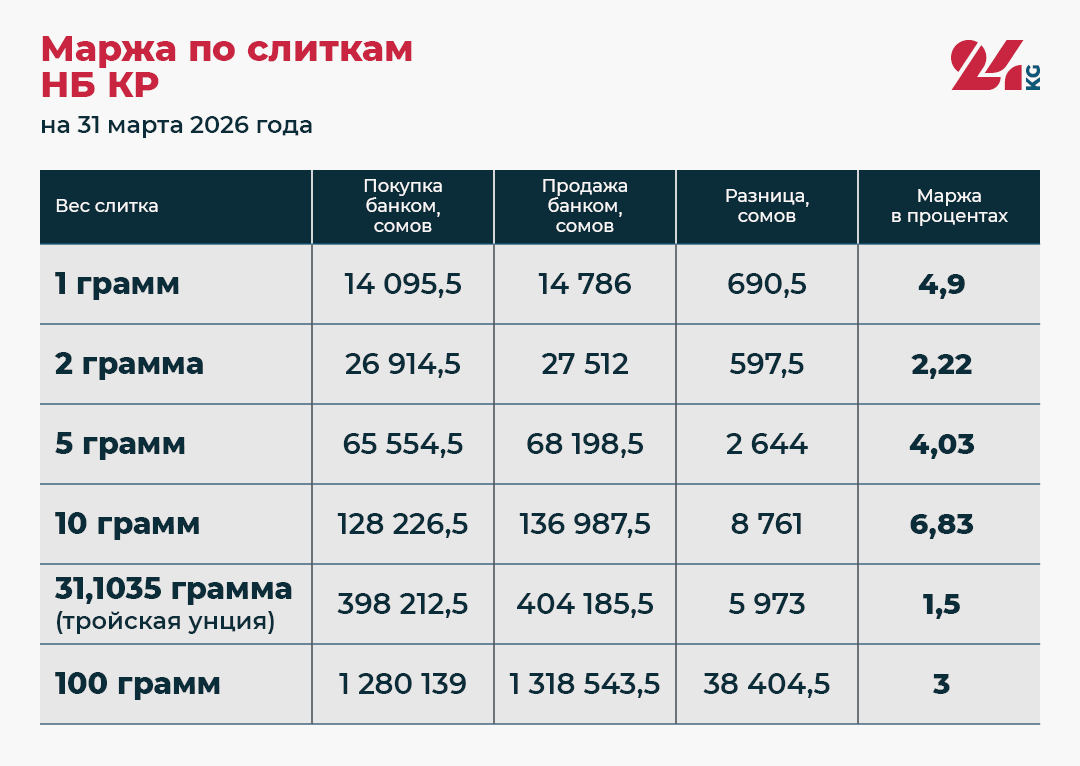 Мы проанализировали и разницу между ценами покупки и продажи (маржу) на мерные слитки Нацбанка Кыргызстана.