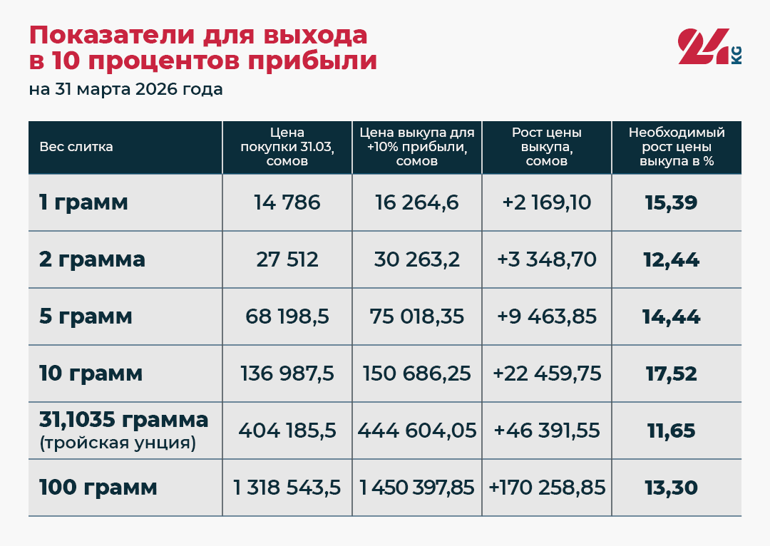 Мы также посчитали, какой должна быть цена, чтобы вы получили, например, чистую прибыль в 10 процентов по конкретному слитку. Иными словами, цена обратного выкупа НБ КР конкретного слитка должна минимум на 10 процентов превышать ту, за сколько вы купили золото.