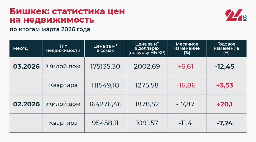 Квартиры достигли пика в январе 2026-го (86 тысяч 503,5 сома).
