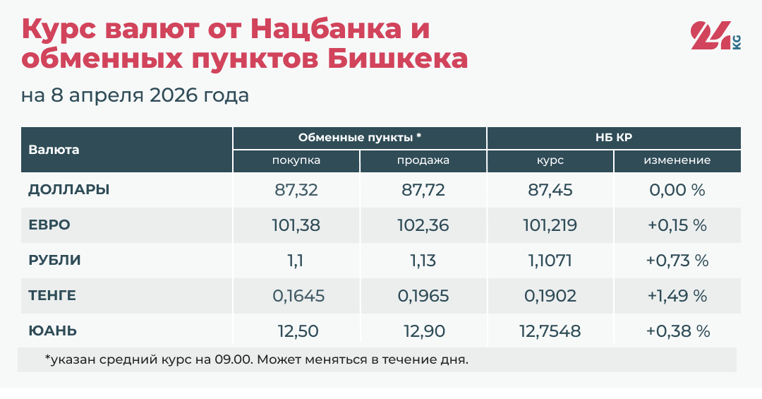 - Официальный курс НБ КР: 87,45 сома (без изменений).