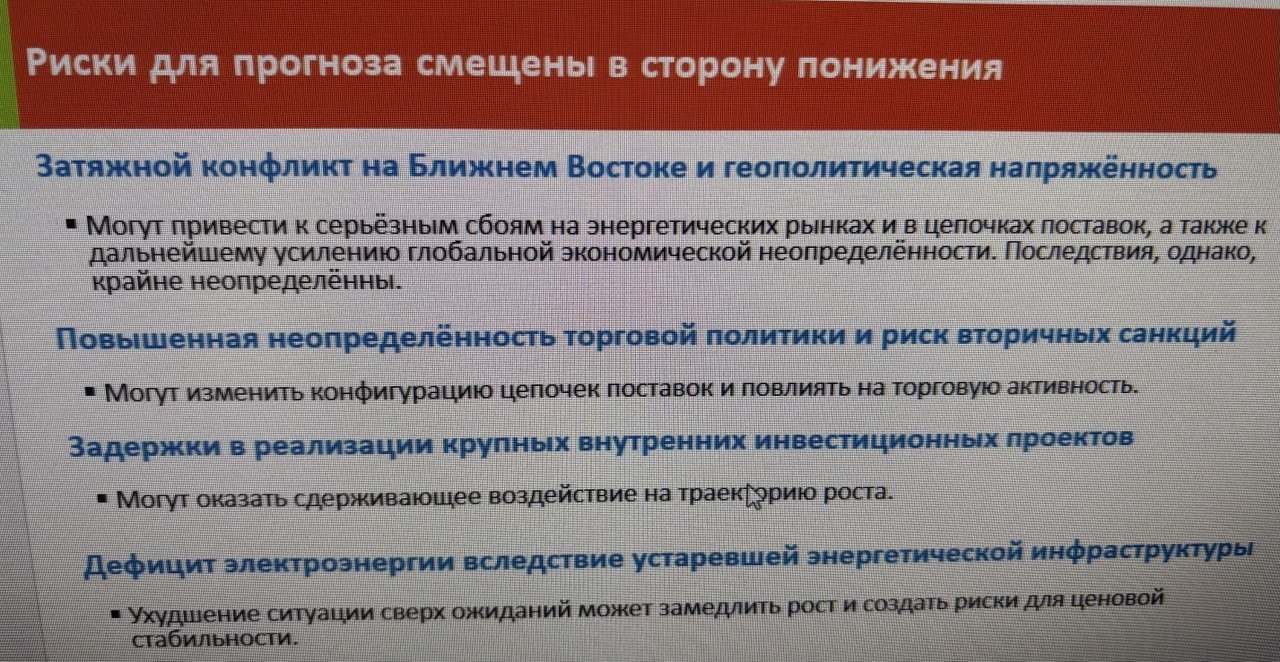 Экономист считает, что прогноз по-прежнему сопряжен со значительными рисками замедления ухудшения, поскольку внешняя среда остается подверженной существенной геополитической и торговой неопределенности.