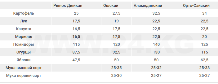 Средние цены на некоторые виды овощей и фруктов, а также на муку на рынках Бишкека: