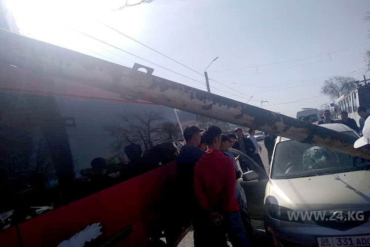 Pole fell on a Mercedes Sprinter minibus in Bishkek. Eyewitnesses informed 24.kg news agency.