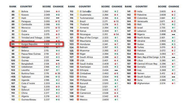 According to the experts, Kyrgyzstan has become a more peaceful country for a year, rising to 95th place in 2019. The republic received 2,105 points, improving its rank by 13 positions. However, Kyrgyzstan is still among the countries with a medium state of peace.