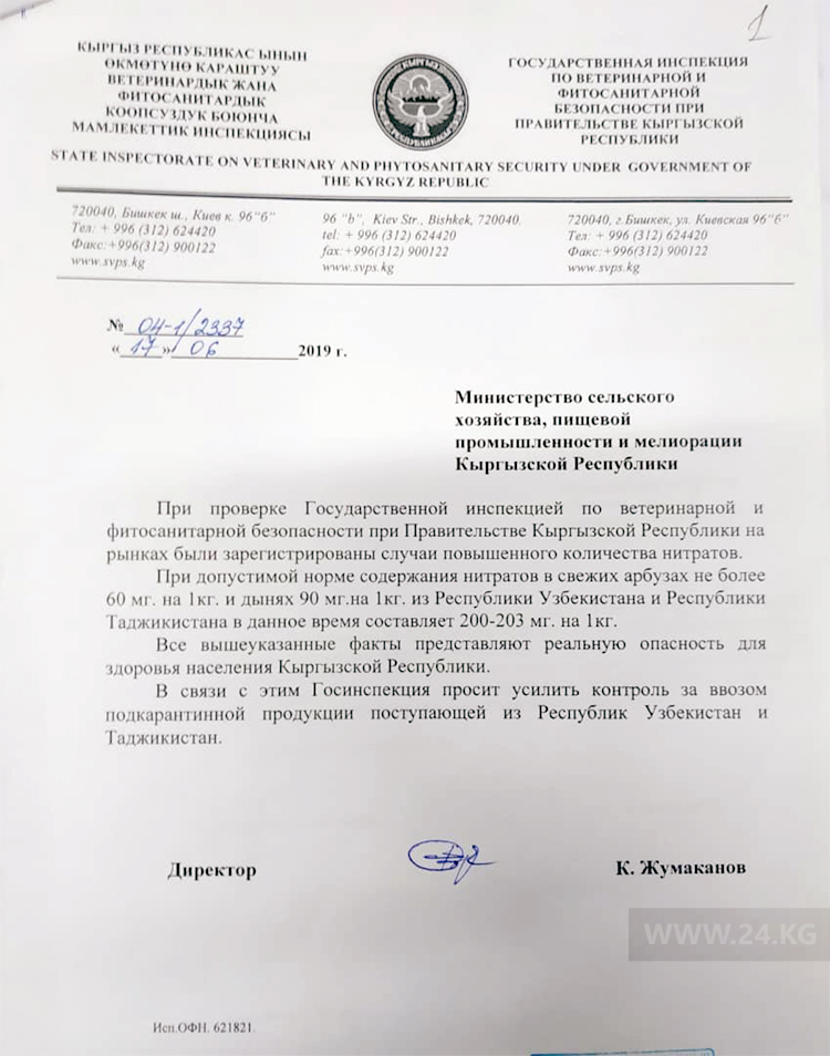 The State Inspectorate for Veterinary and Phytosanitary Safety of Kyrgyzstan asks to tighten control over the import of watermelons and melons from Uzbekistan and Tajikistan. Official letter of the head of the inspectorate Kalys Zhumakanov to the Ministry of Agriculture says.