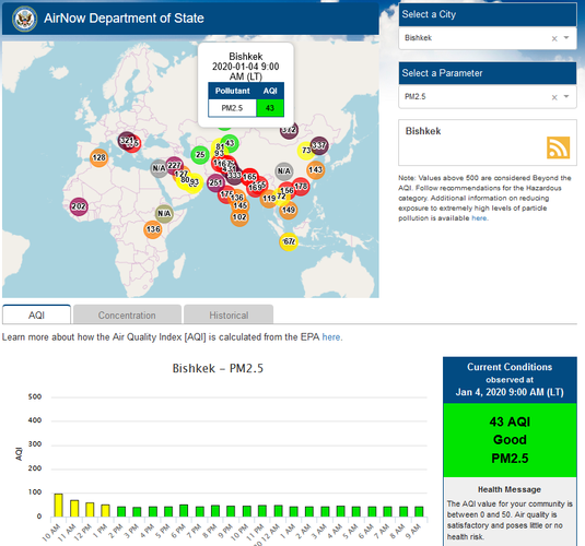 The U.S. Embassy in Kyrgyzstan also installed a sensor. It shows the air quality index online. Information is updated hourly.