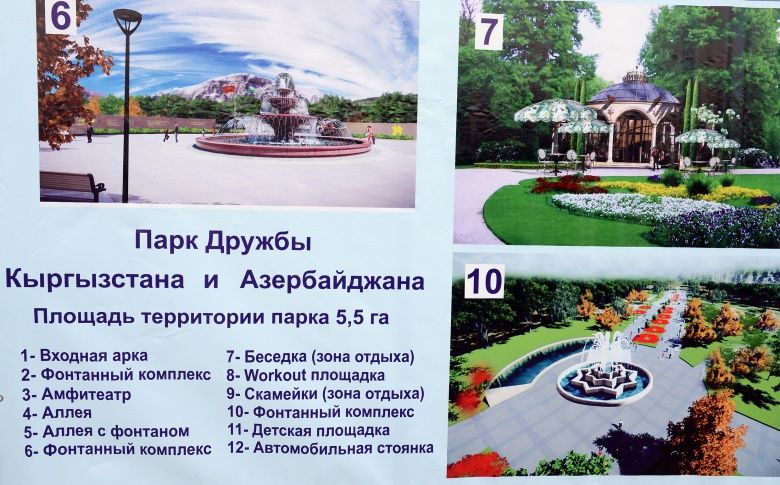 According to Bishkek City Hall, the Friendship Park of Kyrgyzstan and Azerbaijan will be located on the territory of 5.5 hectares. It will have fountains, artificial pools, an outdoor amphitheater, playgrounds and many other things.