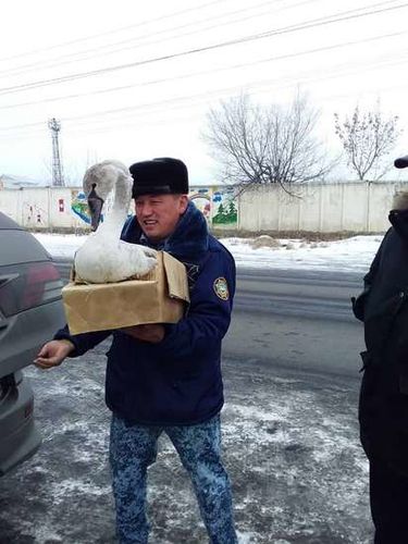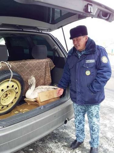 According to her, this happened the day before. The frozen bird was found in Tyup bay during a regular raid. Inspectors of the department warmed the swan and handed it over to Karakol Zoo.