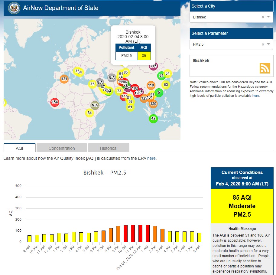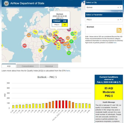 The U.S. Embassy in Kyrgyzstan also installed a sensor. It shows the air quality index online. Information is updated hourly.