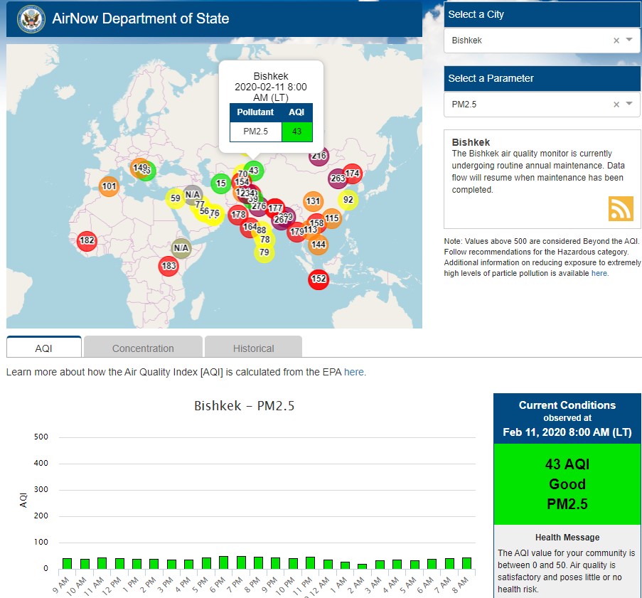 The U.S. Embassy in Kyrgyzstan also installed a sensor. It shows the air quality index online. Information is updated hourly.