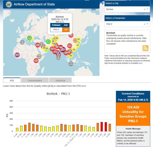 The U.S. Embassy in Kyrgyzstan also installed a sensor. It shows the air quality index online. Information is updated hourly.
