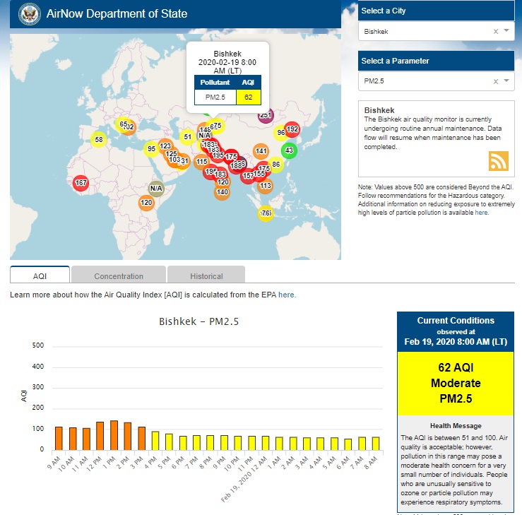 The U.S. Embassy in Kyrgyzstan also installed a sensor. It shows the air quality index online. Information is updated hourly.