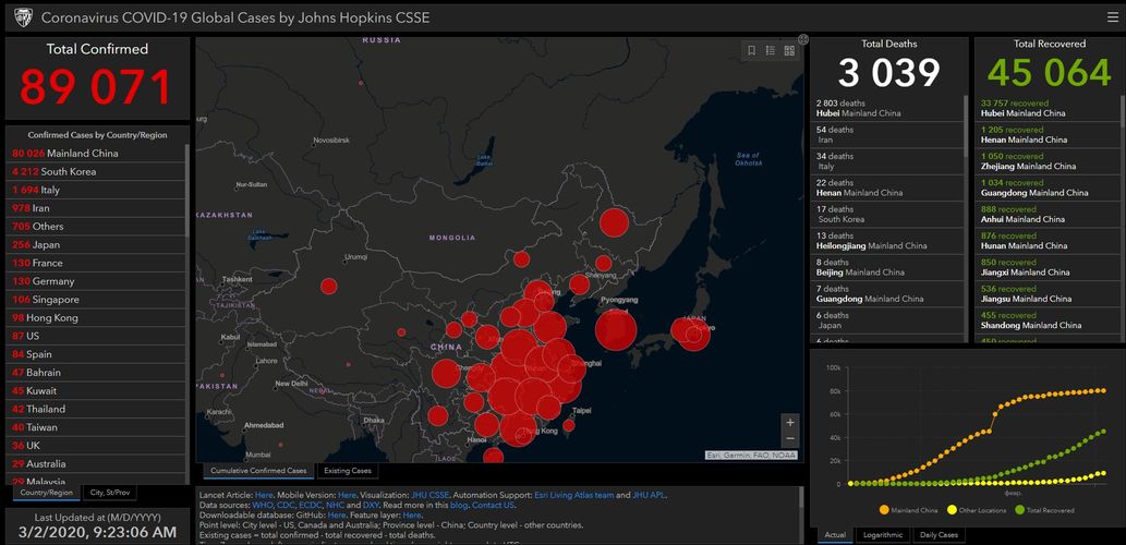 Number of people who died from a novel coronavirus reached 3,039 people. Data of an online map developed by scientists say.