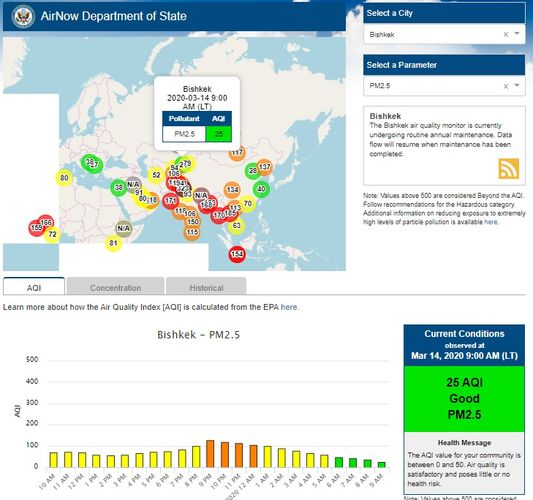 The U.S. Embassy in Kyrgyzstan also installed a sensor. It shows the air quality index online. Information is updated hourly.