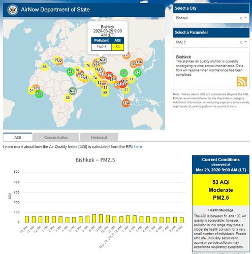 The U.S. Embassy in Kyrgyzstan also installed a sensor. It shows the air quality index online. Information is updated hourly.