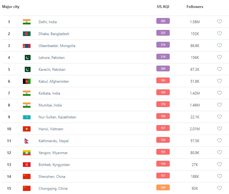 As of 8.30 am, Bishkek took the 13th place in World Air Quality Index ranking of the largest cities in the world.
