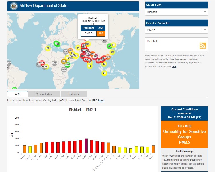 The U.S. Embassy in Kyrgyzstan also installed a sensor. It shows the air quality index online. Information is updated hourly.