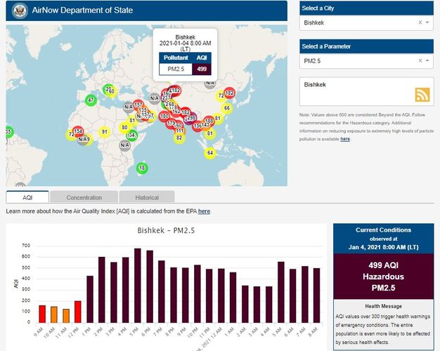 The U.S. Embassy in Kyrgyzstan also installed a sensor. It shows the air quality index online. Information is updated hourly.