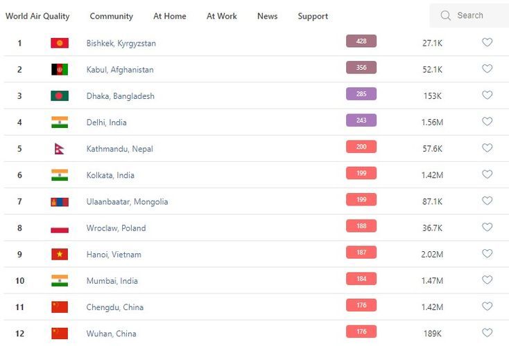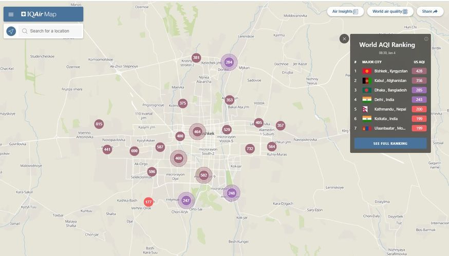 Bishkek takes the 1st place in the World Air Quality ranking of the largest cities in the world.