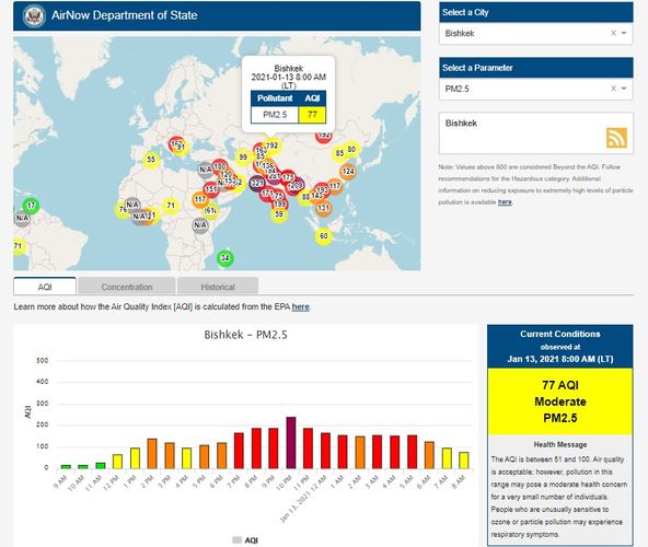 The U.S. Embassy in Kyrgyzstan also installed a sensor. It shows the air quality index online. Information is updated hourly.
