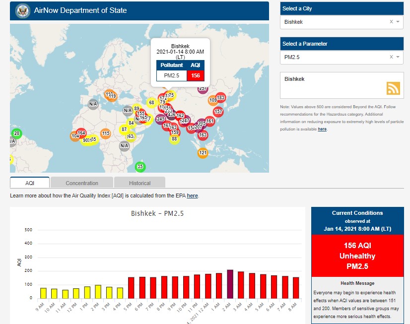 The U.S. Embassy in Kyrgyzstan also installed a sensor. It shows the air quality index online. Information is updated hourly.