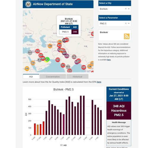The U.S. Embassy in Kyrgyzstan also installed a sensor. It shows the air quality index online. Information is updated hourly.