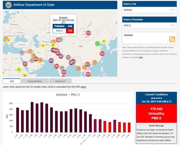 The U.S. Embassy in Kyrgyzstan also installed a sensor. It shows the air quality index online. Information is updated hourly.